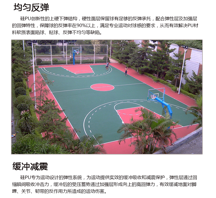 硅PU是一種符合人體工學(xué)原理并滿足運(yùn)動(dòng)物理特性需要,具備上硬下彈結(jié)構(gòu)特征并能直接在水泥或?yàn)r青基礎(chǔ)上施工的健康型專業(yè)彈性合成球場面層材料系統(tǒng),以單組份有機(jī)硅改性聚氨酯組成緩沖回彈結(jié)構(gòu),雙組份改性丙烯酸作為耐磨面層