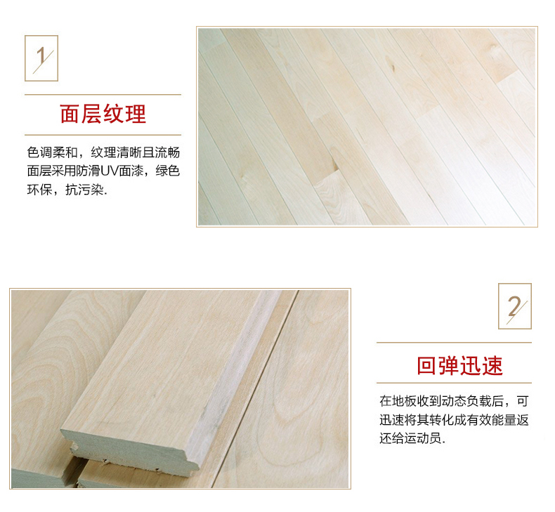 專業(yè)運用到運動場上的地板,全部是由純實木原料構(gòu)成。純實木原料本身屬于環(huán)保性原料,無任何刺激性氣味,保證大家的身體健康。同時防水功能比較好,對于濕潤的環(huán)境,有著良好的自動控制干濕度的功能。另外,運動館地板的實木原料大多數(shù)是選用的國外進口樹種。通過一系列的高溫高壓技術(shù)后,把細菌與樹蟲殺掉,隨后再根據(jù)規(guī)格尺度進行款式設(shè)計,從而就制造出專業(yè)的運動館地板。所以,如此珍貴,功能如此之多的木地板,想必都想讓它能多用一段時間吧。